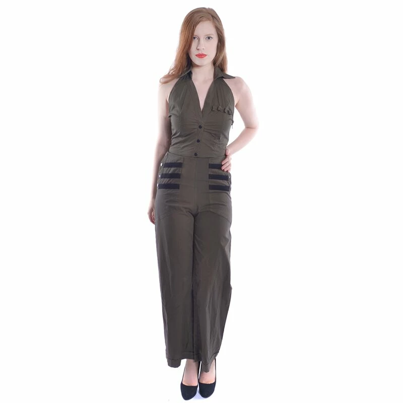 Un peu de vintage mêlé de militaire. La combinaison Victoria de Rockabella est la combinaison longue parfaite pour l’été. La combinaison est en lin de coton léger. De nombreux détails super des années 60 tels que le col, les boutons décoratifs et les rayures donnent une vraie sensation rétro.