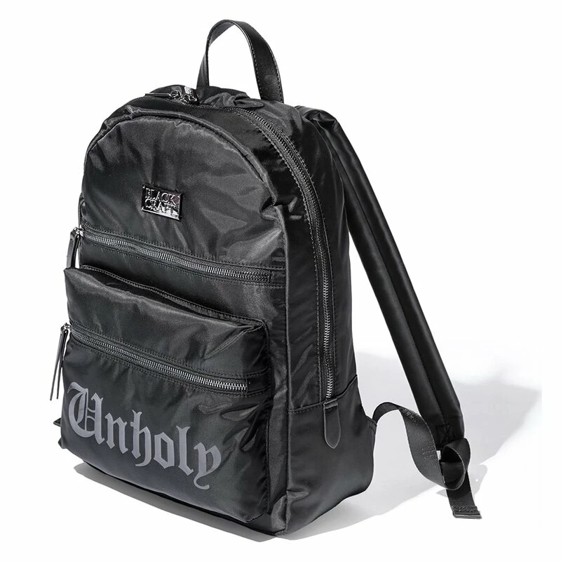 Je n’ai pas besoin de cacher mes secrets les plus sombres au monde. Approchez-vous et laissez-vous entraîner dans mon piège. Le sac à dos Blackcraft Cults Unholy a le lettrage éponyme et une étiquette « Black Craft » sur le devant. Le sac à dos est fait de nylon solide avec des détails en cuir synthétique. À l’intérieur se trouve un compartiment zippé et une cloison pour les ordinateurs portables. Il y a deux autres compartiments zippés à l’extérieur. La doublure intérieure est imprimée de pentagrammes Baphomet.