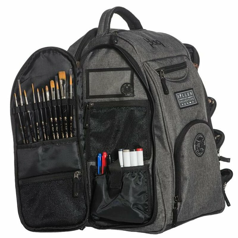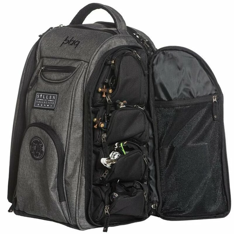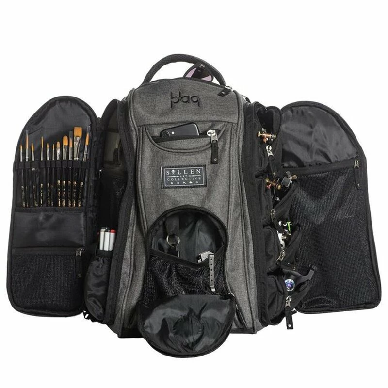 Fantastique sac à dos par Sullen Art Collective qui offre de l’espace pour tout lorsque vous êtes artiste. Le Sullen Art Collective est une collaboration de plusieurs artistes de tatouage et de graffiti, et ce sac à dos est spécialement conçu pour leurs besoins. Le sac à dos est légèrement rembourré sur tous les côtés et renforcé avec un revêtement en vinyle hydrofuge pour protéger le contenu. Le matériau est résistant à l’usure et imperméable, avec des fermetures à glissière spéciales de protection contre l’eau. Les bretelles sont réglables en longueur et, comme la poignée, légèrement rembourrées. Le grand compartiment principal contient une cloison et une bande élastique pour les ordinateurs portables ou les boîtes d’alimentation Sullen (disponibles séparément). Le sujet principal contient toujourstrois poches latérales et un support velcro pour les articles sensibles. Le compartiment droit comprend des fentes pour 12 brosses, deux poches en filet avec fermeture éclair, une poche avec velcro et une fenêtre de visualisation pour les cartes de visite. Le compartiment gauche a une grande poche en filet et quatre compartiments rembourrés avec fermetures à glissière. L’avant a trois compartiments supplémentaires avec fermetures à glissière, le fond contient un petit compartiment en filet et un mousqueton. (Les boîtes d’approvisionnement, les machines à tatouer et les accessoires ne sont PAS inclus).