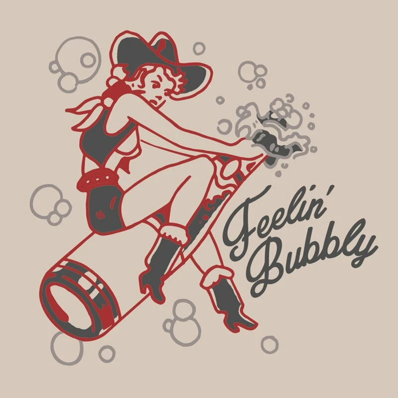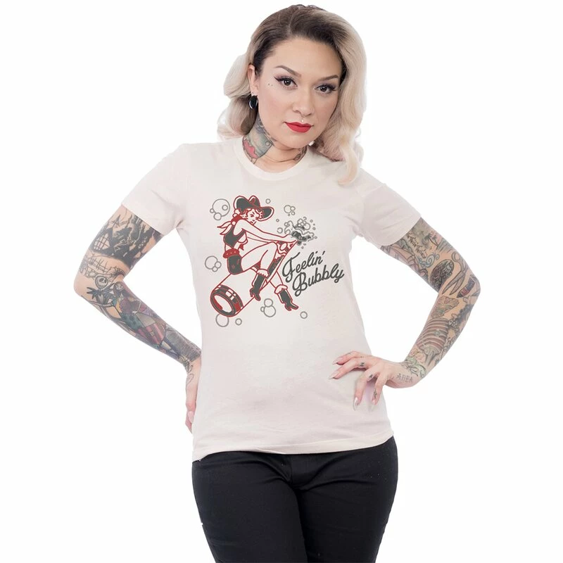 T-shirt rockabilly vintage de Steady Clothing, avec une impression d’une pin-up de cow-girl sauvage essayant d’apprivoiser une bouteille de champagne devenue sauvage. Ă€ cĂ´tĂ© de l’impression se trouve un lettrage « Feelin ‘Bubbly ».