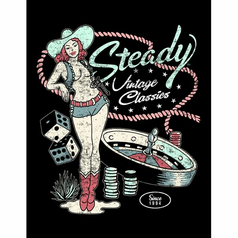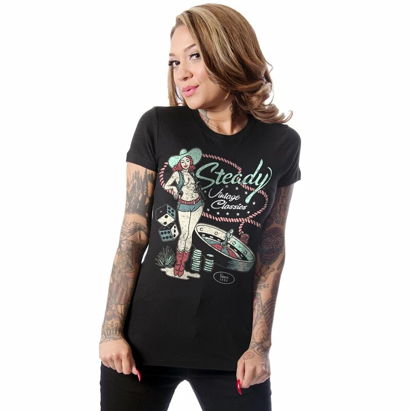 T-shirt rockabilly vintage de la collection Steady Clothings Sun Records. L’imprimé montre divers motifs de casino, comme la roue ROulette, les dés et une cow-girl pin-up.