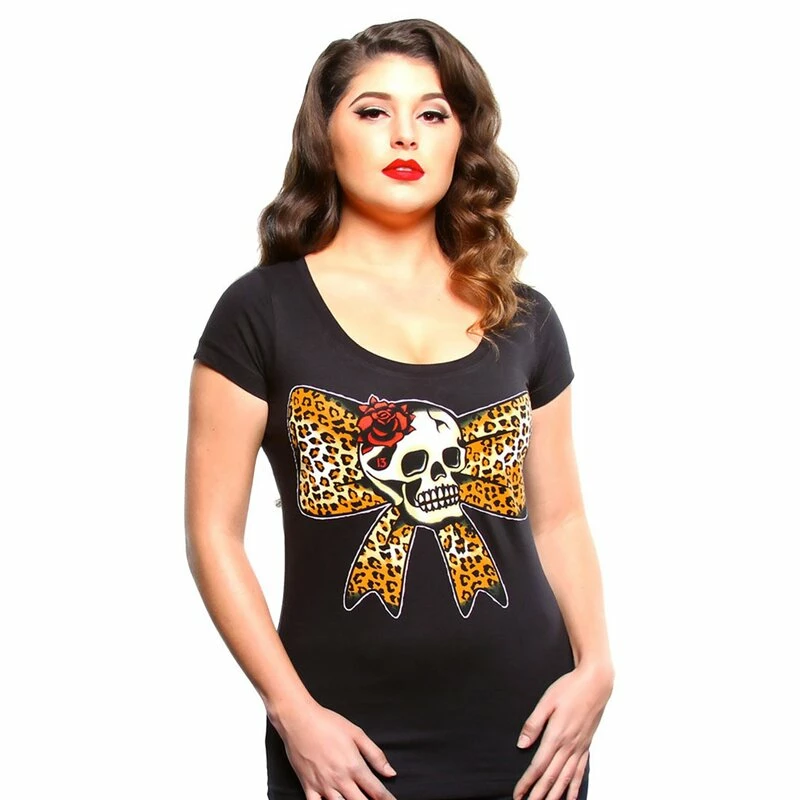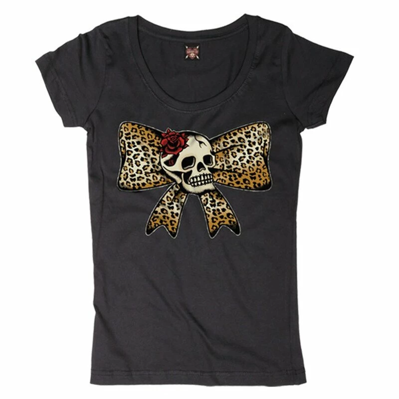 T-shirt cool de Lucky 13 avec une mignonne impression d’un gros arc à motif léopard. Au milieu de la proue, il y a un crâne souriant avec une rose dans le crâne et un petit « 13 ».