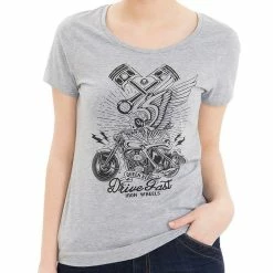 Queen Kerosin combine le style motard à bascule magistral avec le rockabilly vintage. Le tee-shirt Drive Fast a une impression d’un ange squelette de course avec deux pistons croisés.