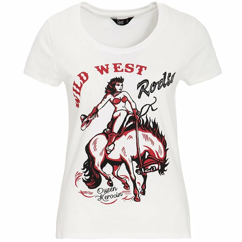 Queen Kerosin combine le style motard à bascule magistral avec le rockabilly vintage. Le T-shirt Wild West a une impression d’une cow-girl sauvage sur son bronco sur le devant.