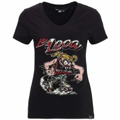 Queen Kerosin combine le style motard à bascule magistral avec le rockabilly vintage. Le T-shirt La Loca a une impression d’un patineur à roulettes monstrueux avec le lettrage éponyme.