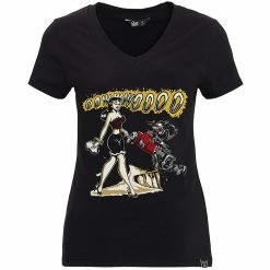 Queen Kerosin combine le style motard à bascule magistral avec le rockabilly vintage. Le T-shirt Oowwwoooo a une impression d’une pin-up classique, qui est admirée par un loup gourmand.