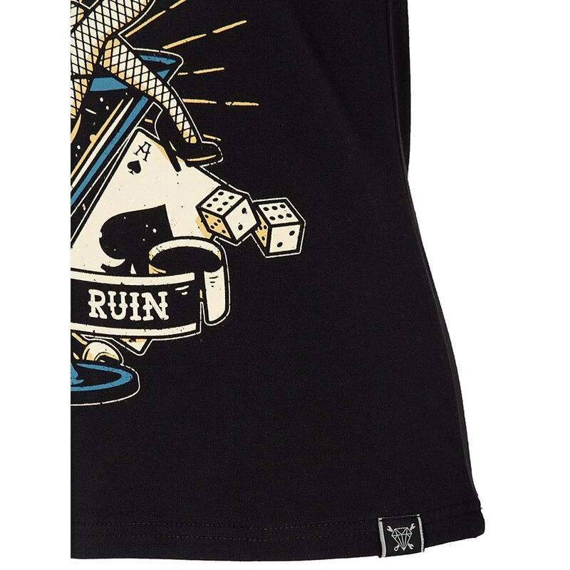 Queen Kerosin combine le style motard à bascule magistral avec le rockabilly vintage. Le T-shirt Ruine de l’homme a une impression d’une pin-up tatouée dans un verre à martini, avec des cubes, une bouteille de vin, une carte à jouer et une clé à l’arrière-plan.