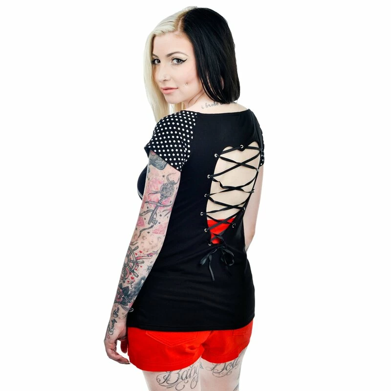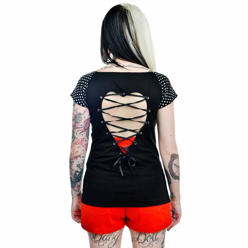 T-shirt classique de Too Fast…, du moins c’est ce qu’il semble de face, ce haut a l’amour du détail que vous connaissez de Too Fast. Dans le dos, on trouve une découpe de c?ur unique avec un laçage en forme de corset. Les manches sont imprimées de jolis points qui complètent à merveille le grand imprimé du devant. Le modèle mesure 150cm, a des mensurations 86/56/90 et porte la taille S.