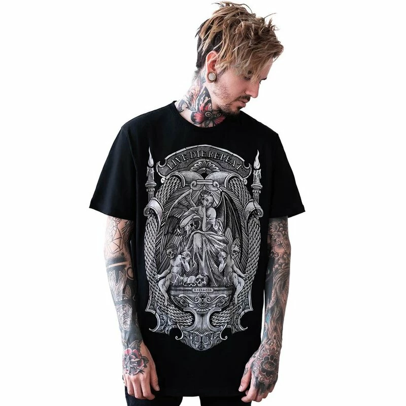 Qu’y a-t-il derrière la matrice ? l’imprimé ancien d’inspiration romaine de Killstar montre une statue de créatures fabuleuses qui sont mi-démon et mi-ange, entourées de crânes et d’un lettrage « Vivre, mourir, répéter ».