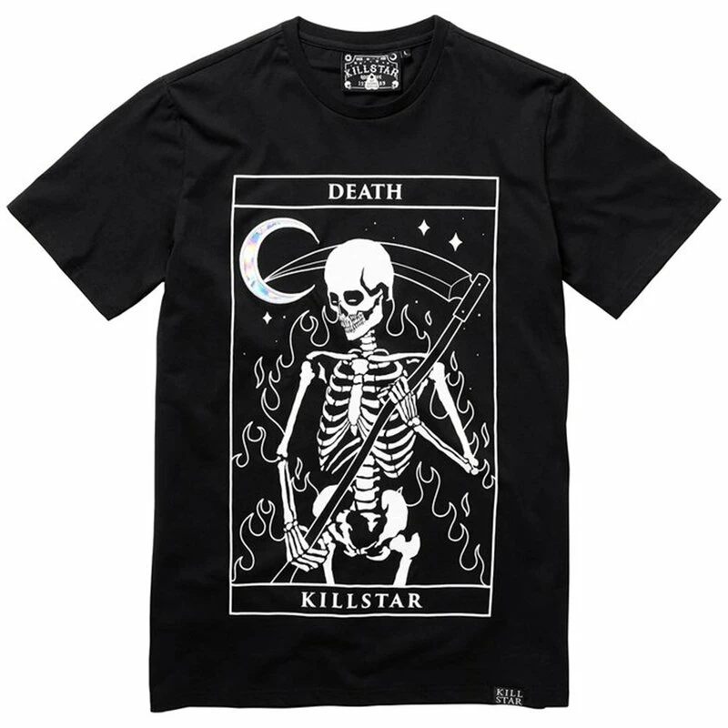 Laissez le passé être et vivez dans le présent … aussi longtemps que vous le pouvez. Killstars Thirteen Print montre une carte de tarot « Death » avec squelette, faux, flammes de l’enfer et ciel étoilé.